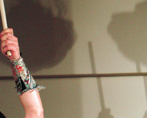 「太鼓にはバランス、きれいさ、アタックの正確さなどが要求される。いろいろな国の楽器とその演奏を聴くと、どれも正確な演奏で素晴らしかった。でも最も観客にうけたのがなまはげ郷神楽。演奏した時、2万人、3万人もの観客が一体化したのを感じた。音楽的なものは大切だが、それは絶対的なものではない。人の気持ちを揺り動かすのは、この一体化する感覚なんじゃないかと思った」そうしてつかんだのが、ごくごく身近な男鹿の風土に根ざしたスタイル。例えば、なまはげが民家に入る時に足を踏みならす「門踏み」のしきたり。七、五、三のリズムを太鼓の拍子に入れ、問答なども太鼓の音にのせていく。たとえ消えてしまった伝説やしきたりでも、その意味合いをニュアンスとして曲の中に込めていく。 「太鼓はモノクロの世界。音の中に思いを込めていけば、見た人、聴いた人が、自分なりに感じ取って自分で色を付けてくれる」 音を打ち鳴らす者と聴く者の心の接点に懸けている。 言葉と心が通じる ふと曲想が思い浮かべば、農作業の合間にも小屋へと走っていく。自分の音楽を志すために、練習場となる小屋を8年前に建てた。「畑にいなければ、大抵ここにいる」と笑う。太鼓に懸ける思いは人一倍だからこそ、いつでも自分で太鼓を追求できる練習場が必要だった。 「技術は自ら常に上へ、上へと持ち上げていかなきゃならない。だから練習しないと腹が立つ」 そう話す目が鋭い。バチを手に太鼓の前で構えれば、踏みしめた両足が体をどっしりと支えているのが分かる。「太鼓はただ叩くわけではない。バチを振り下ろす時の落ちるエネルギーと、上へと引っ張るエネルギーの遠心力が大切。力点が作用するところだけ力を入れて、あとは力を抜いてコントロールする」という。 太鼓は遠くへ音を響かせるための原始的な楽器だ。 「太鼓が響けば、言葉も心も通じる」 そう言って打ち鳴らす太鼓の音が、あたりの雪景色に溶け込んでいく。雪が解ければ、男鹿の山々にまた山菜の季節が訪れる。 |